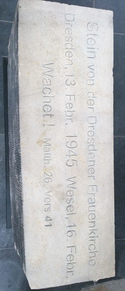 Der neue Stein markiert einen Brückenschlag zwischen zwei kriegszerstörten Städten. So werden auch im Gottesdienst am Sonntag, 8.3 im Dom mit Pfarrer in i.R. W. Abresch, Pfarrer Treutmann von der Frauenkirche aus Dresden und Pfarrerin Biebersdorf Vertreter aus beiden Städten mitwirken. Im Jahr 1995 wurde ein Stein von unserem Willibrordi-Dom nach Dresden geschickt zum Gedenken an die im 2. Weltkrieg fast vollständig untergegangene Stadt. Der Stein trug die Inschrift: „Dresden-Wesel“ mit den Daten, der beiden Städte: „13.2.1945“ (Dresden) – „16.2.1945“ (Wesel) und dem Bibelwort: „Wachet!“ Dem Willibrordi-Dom wurde auf Anfrage von Pfarrer Abresch nun ein Stein noch von der alten Dresdener Frauenkirche geschenkt. Er trägt nun dieselbe Aufschrift. Pfarrer Treutmann aus Dresden wird dazu ein Grußwort sprechen. Im Gottesdienst ist dieser Stein erstmals im Dom zu sehen. Nicht klein, aber auch nicht zu groß! Man soll etwas sehen können…