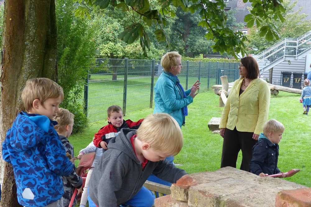 Ulrike Westkamp, Wesels Bürgermeisterin, besuchte am Mittwoch, 9.9., die Evangelische Tageseinrichtung für Kinder in der Kastanienstraße (Kita am Lauerhaas). Sie kann offenbar gut zuhören. Sabine Ziehm, Kita-Leiterin in der Kita am Lauerhaas, liess es sich nicht nehmen, ihre Einrichtung der ersten Frau der Stadt mit den vielfältigen und kindgerechten Räumlichkeiten ausführlich vorzustellen. Dabei ging es natürlich auch um den Alltag in der Kita am Lauerhaas, in der über 40 Kinder zwischen 2 und 6 Jahren betreut, gebildet und erzogen werden. Es wurde deutlich, dass der Kita in den vergangenen Jahren mehr und mehr Aufgaben seitens der Eltern zugetraut und übertragen werden. Das siebenköpfige Team, das seit geraumer Zeit nicht nur in neuen Räumlichkeiten arbeitet sondern auch in neuen Formen, sei sehr motiviert und sehr gut auf die Herausforderungen eingestellt, sagte Ziehm. Ulrike Westkamp wurde bei dem Besuch von einem kleinen Tross städtischer Mitarbeiter begleitet. Außerdem wurde sie von Pfarrerin Martina Biebersdorf, Beauftragte für die kirchlichen Kitas in der Ev. Kirchengemeinde, sowie von Pfarrerin Eva Holthuis ,Ortspfarrerin und für die pädagogisch-theologische Begleitung der Kita zuständig, über die Arbeit unterrichtet. Ulrike Westkamp zeigte sich erfreut über die beispielhaft gute Zusammenarbeit zwischen Evangelischer Kirche und Kommune in diesem Sektor.
