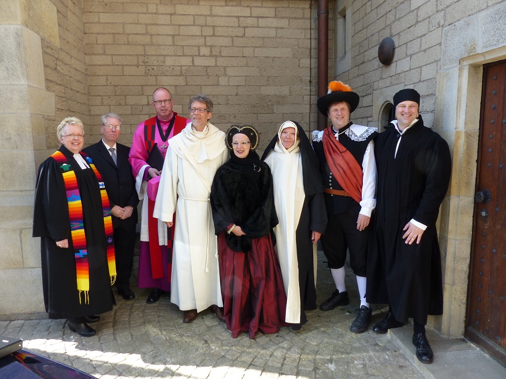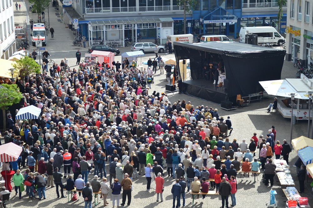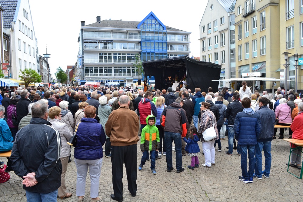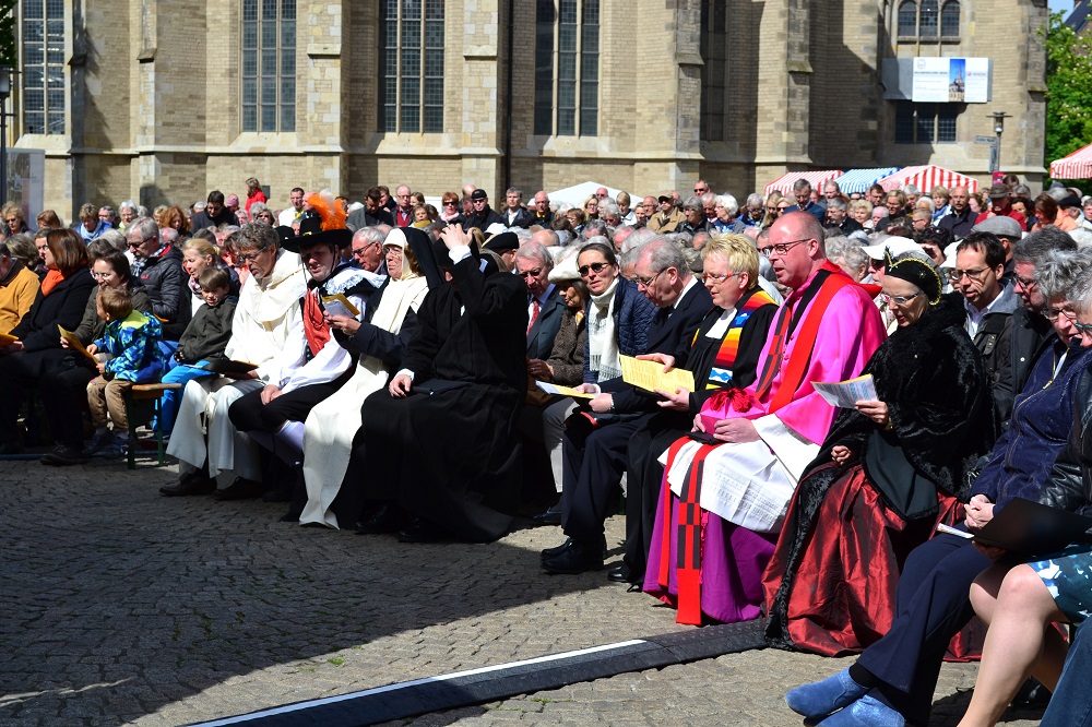 Geschätzte 600-700 Besucher nahmen am ökumenischen Stadtgottesdienst an Pfingstmontag auf dem Großen Markt teil. Er stand unter dem Motto "Suchet der Stadt Bestes ... und betet für sie! Im Gottesdienst traten vier historische Gestalten aus der Stadtgeschichte Wesels auf, die im Dialog mit Jeremia darüber sprachen, wie sie damals für das Wohl der Stadt eingetreten seien. Musikalisch unterstützt wurden die Besucher durch "das Himmelfahrtskommando" , eine Kirchenband von der katholischen Kirchengemeinde, sowie durch einen Bläserchor aus der Ev. Kirchengemeinde. Bürgermeisterin Ulrike Westkamp und viele weitere Weseler waren der Einladung gefolgt. Jeremia (dargestellt von Pastoralreferent Raphael Günter) lud mit den historischen Gestalten dazu ein, Sonnenblumensamen zu pflanzen, um die Stadt erblühen zu lassen.