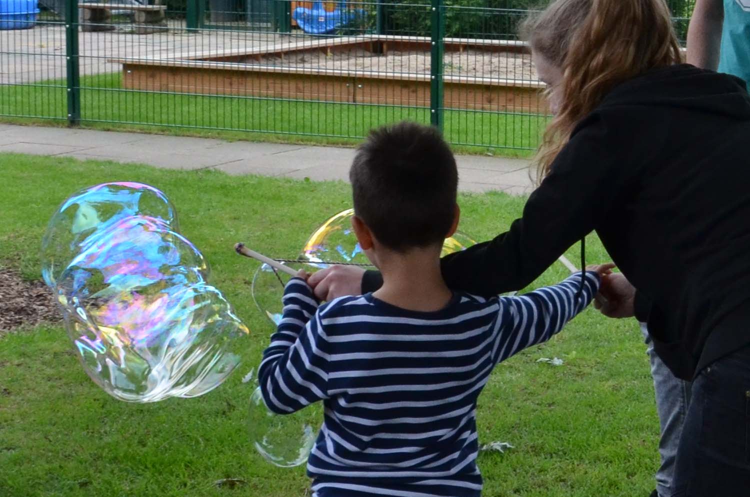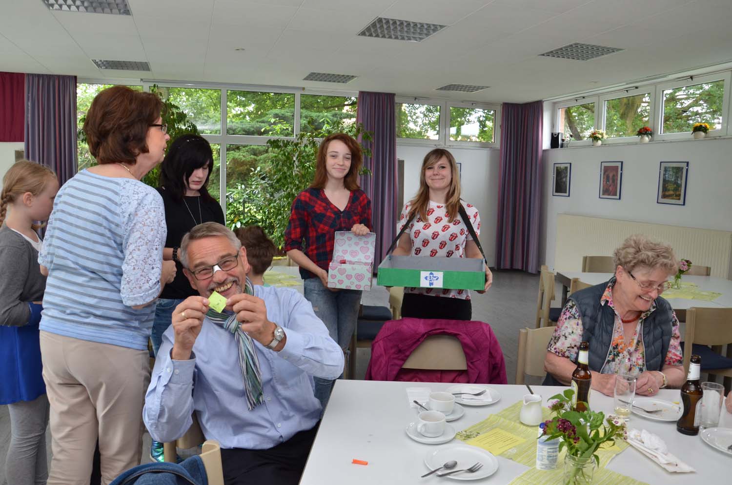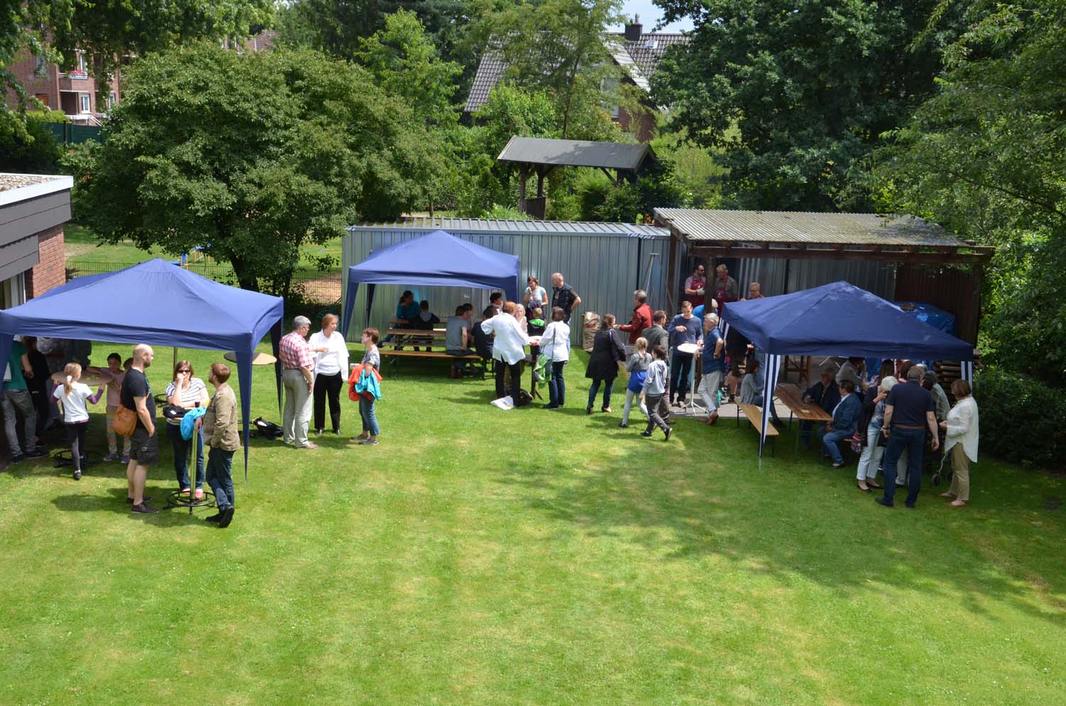 Den Auftakt bildete ein wunderbar vom Projektchor begleiteter Gottesdienst, in dem auch der nachberufene Presbyter Jörg Titze in sein Amt eingeführt wurde. Danach konnten sich die Kleinen auf der Hüpfburg austoben oder viele Spiele auf dem Kita-Gelände ausprobieren, so z. B. Ringewerfen auf Enten oder Riesenseifenblasen machen. Die Erwachsenen saßen gemütlich am Grill oder Getränkestand zusammen und freuten sich, den einen oder die andere einmal wiederzutreffen. Ein Höhepunkt war am Nachmittag der Auftritt des Blasorchesters aus Drevenack: Unter der Leitung von Andre Unterloh präsentierten die Kinder und Jugendlichen ein buntes Programm und hatten sichtlich viel Spaß dabei. Dazu gab es Kaffee und Kuchen vom Büffet, Der Erlös des Gemeindefestes wird geteilt: Eine Hälfte geht an Brot für die Welt, die andere an die Aktion "Stolpersteine", die an die Vertreibung und Ermordung unterschiedlicher Bevölkerungsgruppen während der Nazi-Diktatur erinnert.