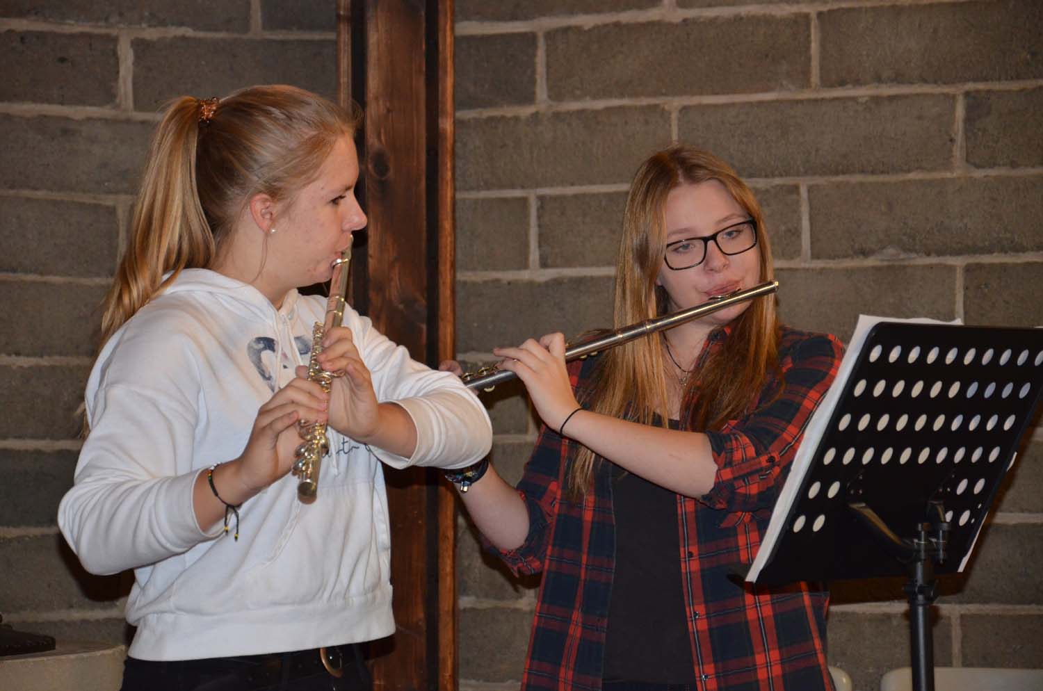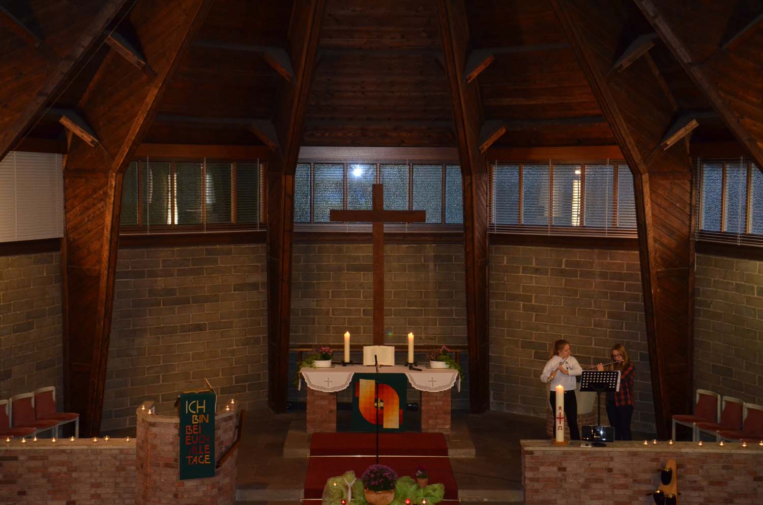 Der Gottesdienst wurde musikalisch begleitet von Quintus N. Sachs, der als Nachfolger von Elena Lebedewa nun auch regelmäßig die Orgel an der Gnadenkirche spielt. Besonders das erste Orgelstück fiel aus dem Rahmen, weil es die bedrohlichen Schlagzeilen mit aufschreckenden und irritierenden Dissonanzen vertonte. Zwei Schülerinnen des AVG, Alexandra und Lorena, trugen mit klassischen Flötenmelodien dazu bei, sich auf die meditiative Stimmung einzulassen.