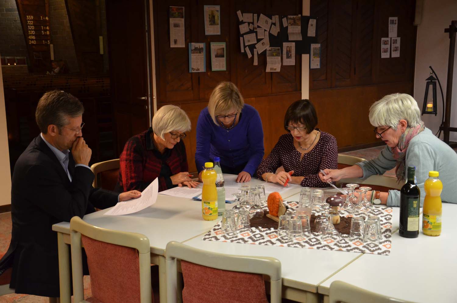 | Das Team: v. l. Pfr. Thomas Brödenfeld, Beate Schmidt, Cornelia Haß, Ulrike Schweiger-Lewin, Bettina Hübner-Gräfer | Viele Gottesdienstgäste blieben noch zum Austausch |
