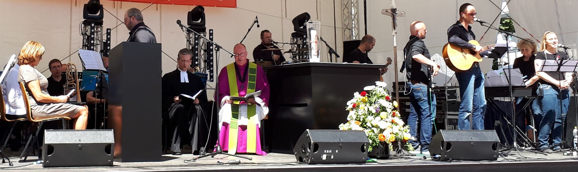 Das Motto "Schalom in Dorf und Stadt", ein Hüschzitat aus einer seiner Psalmdichtungen, konnte kaum besser in Szene gesetzt werden. Das Bilderbuchwetter, die zahlreichen Besucher, die harmonischen Klänge von der katholischen Kirchenband "Himmelfahrtskommando" und dem Bläserchor und Synodalen Bläserkreis und schließlich die biblischen Texte und Auslegungen trugen dazu bei.