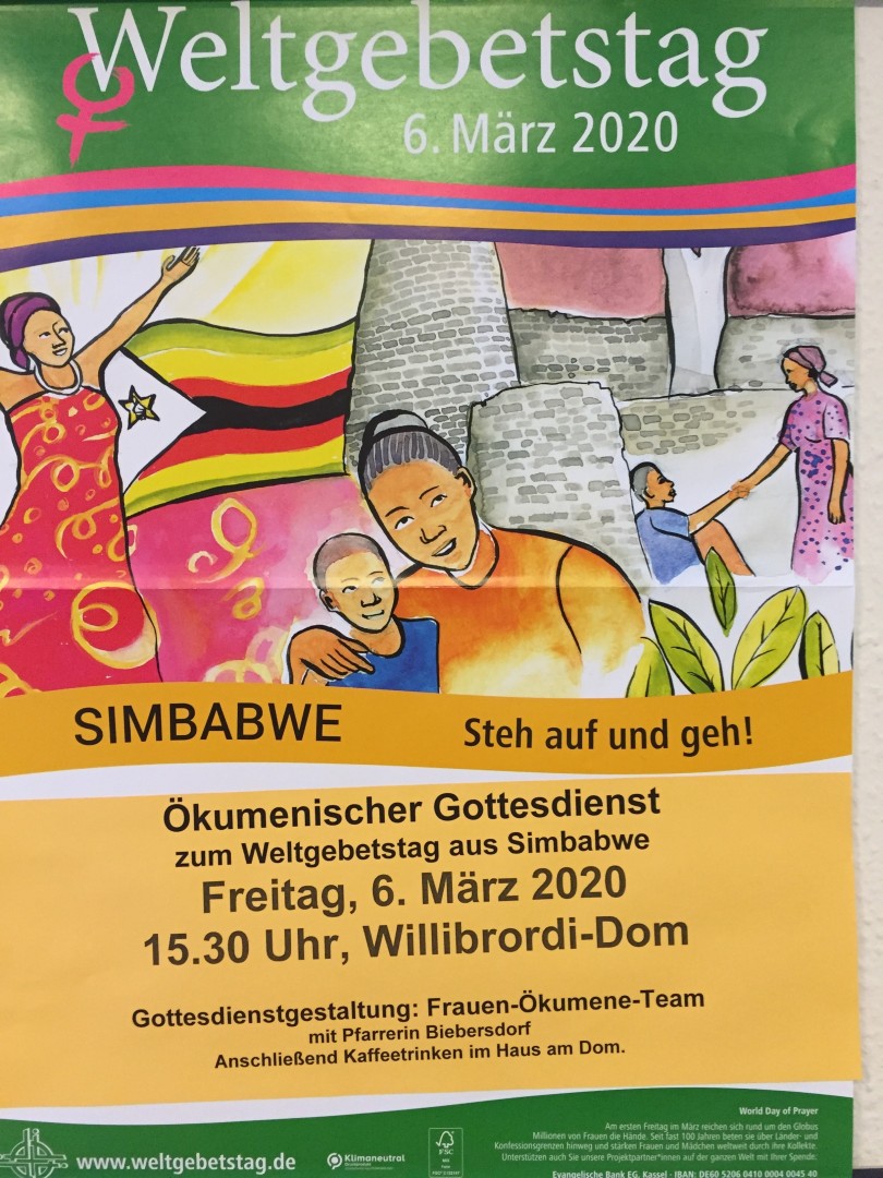 2020 kommt der Weltgebetstag aus dem südafrikanischen Land Simbabwe. Frauen aus Simbabwe haben den Bibeltext aus Johannes 5 zur Heilung eines Kranken ausgelegt: „Steh auf! Nimm deine Matte und geh!“ Sie geben weiter, dass Jesu Aufforderung allen gilt.Verbunden mit der gemeinsamen ökumenischen Liturgie und spirituellen Liedern ist auch eine Unterschriftenaktion für einen Schuldenerlass.Das ökumenische Vorbereitungs-Team lädt sehr herzlich ein zum Gottesdienst um 15:30 Uhr im Willibrordi-Dom. Vorher wird das WGT Land kurz vorgestellt. Im Anschluss Kaffeetrinken im Haus am Dom. (Möglichkeiten zur Handdesinfektion sind im Dom und Haus am Dom selbstverständlich vorhanden.) |