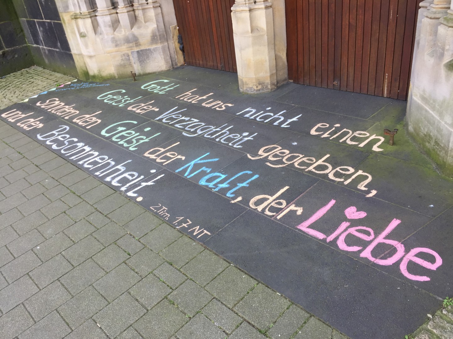 Jeden Tag stürmen neue Corona-Schlagzeilen und Nachrichten auf uns ein. Da ist es gut, ein „Hoffnungswort im Vorübergehen“ zu lesen, zum Beispiel in den nächsten Wochen am Willibrordi-Dom. Den Auftakt machten Pfarrerin Martina Biebersdorf und Dom-Ehrenamtliche Kathja Kuhn am Nordportal/Haupteingang mit einem Pauluswort aus 2.Timotheus 1, Vers 7. Die Idee, mit Straßenkreide tätig zu werden, haben sie von Duisburger Pfarrern gerne übernommen. Schon kurz nach der Fertigstellung gab es viel positive Resonanz von Passanten. Weitere Hoffnungsworte werden folgen…