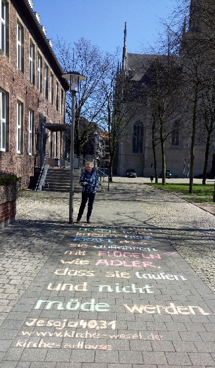 Vor dem Altenheim am Willibrordi-Platz ist auf dem Weg zu lesen: "Die auf den HERRN hoffen, kriegen neue Kraft, dass sie auffahren mit Flügeln wie Adler, dass sie laufen und nicht müde werden" (aus Jesaja 40, Vers 31).