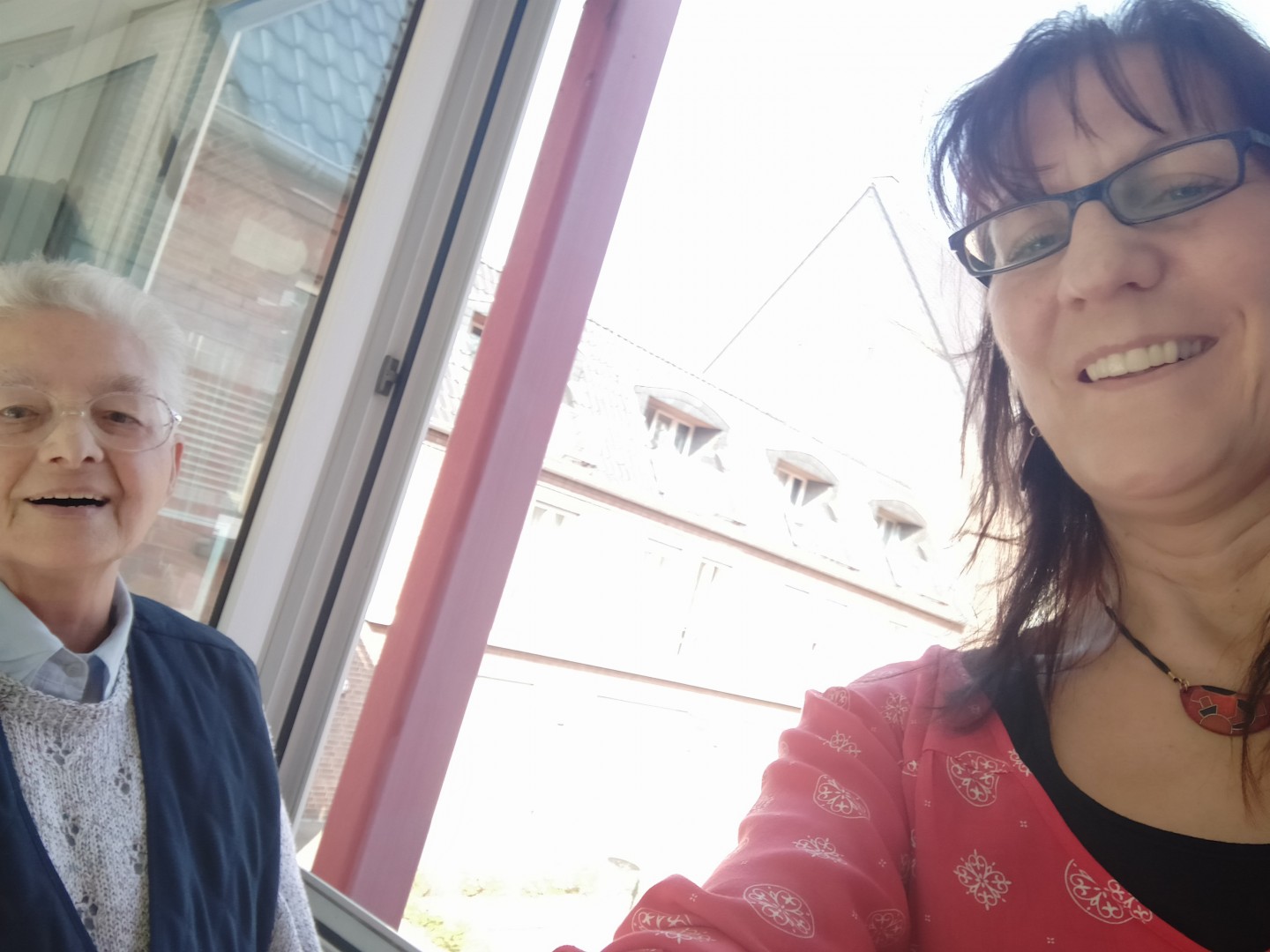 Pfarrerin Martina Biebersdorf hat den Standort bewusst ausgewählt. Sie und Dom-Ehrenamtliche Kathja Kuhn zeichneten das Wort auf als großes Danke-Schön und Ermutigung für alle, die in der Pflege und Betreuung nicht nur dort, sondern überall in Altenheimen, Krankenhäusern und im mobilen Dienst alles geben unter immer schwierigeren Bedingungen. Gleichzeitig ist es ein Hoffnungsgruß für alle Bewohnerinnen und Bewohner, die tapfer in der Kontaktsperre ausharren und sich über jeden Impuls freuen. Ulla Schumacher vom Team und Johanna Boßerhoff als Bewohnerin nahmen schon beim Entstehen frohen Anteil durch die Fenster.