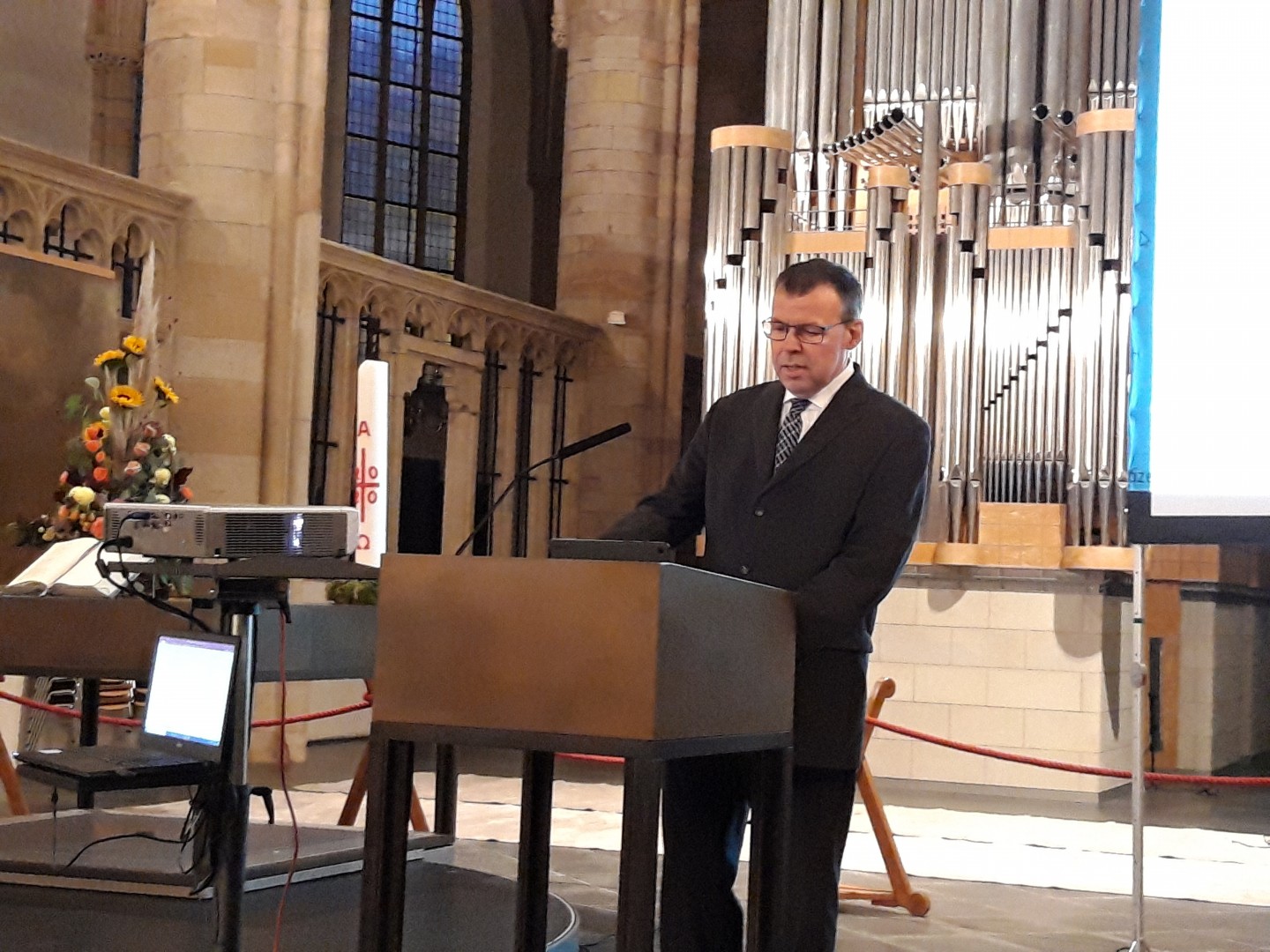 Die Gemeindeversammlung zum Thema "Zukunft des Lutherhaus-Gebäudekomplexes" fand am 8. Oktober unter dem Vorzeichen der herrschenden Corona-Bedingungen im Willibrordi-Dom statt. Der Vorsitzende des Presbyteriums, Pfarrer Dr. Christoph Kock, erläuterte die Ergebnisse eines intensiven Beratungsprozesses vor einem Publikum von ca. 30 interessierten Gemeindegliedern, die in weitem Abstand voneinander im Schiff des Domes saßen. Er betonte, dass man nun mittlerweile "nach einem Langstreckenlauf der Beratungen" zu der Überzeugung gelangt sei, dass die Finanzierungsmöglichkeiten der Kirchengemeinde nicht ausreichen würde, das moderne Verwaltungsgebäude (gebaut 1973) zu sanieren und gleichzeitig auch das historische Lutherhaus zu erhalten und eine hinreichende Nutzung zu gewährleisten. Die Kirchengemeinde wolle mit dieser Maßnahme die wirtschaftliche Handlungsfähigkeit insgesamt erhalten und verstärkt in Personen und Dienstleistungen investieren und Lasten, die aus Gebäuden entstehen, reduzieren.