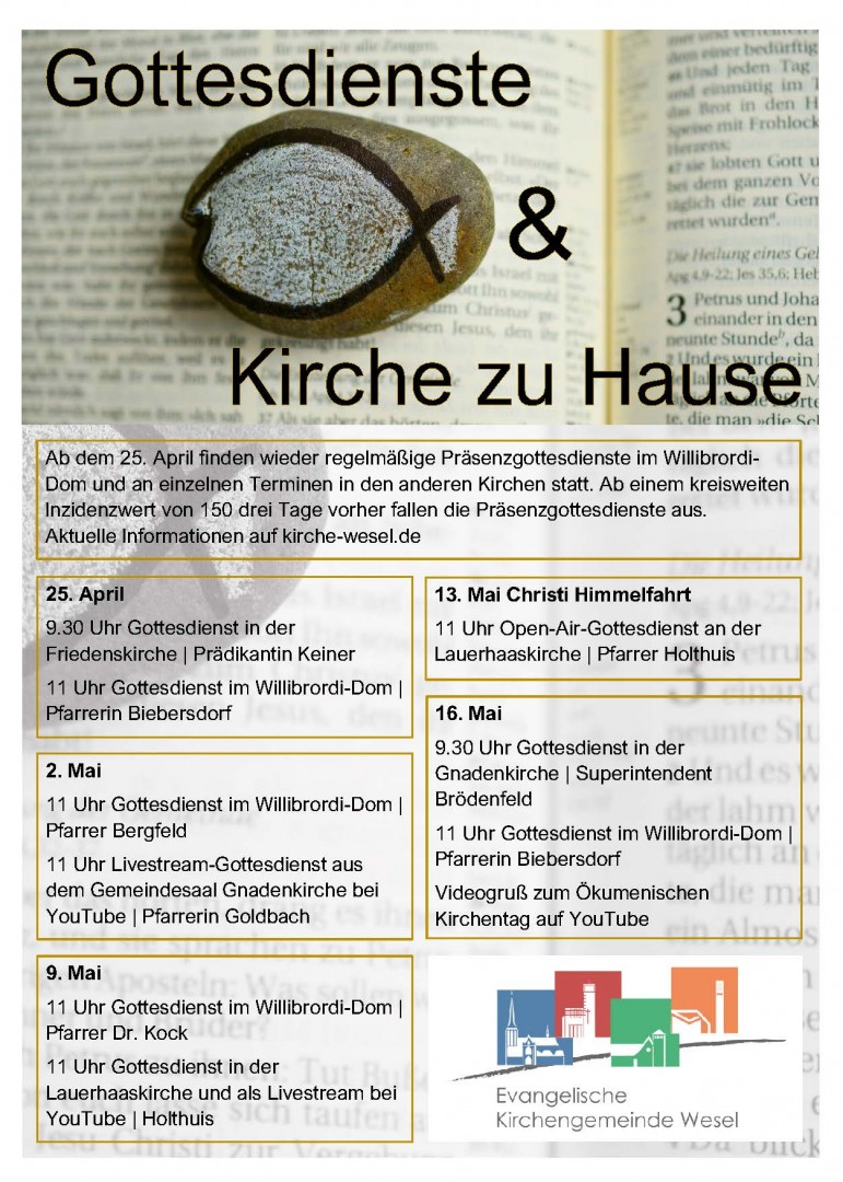Das Presbyterium der Evangelischen Kirchengemeinde hat sich am 19.4. für eine moderate Lockerung bei der Frage der Möglichkeit von Präsenzgottesdienste entschieden. Für den Zeitraum bis zur nächsten Sitzung in vier Wochen (bis 16.5.) wurde beschlossen, ab dem 25. April wieder regelmäßige Präsenzgottesdienste im Willibrordi-Dom und an einzelnen Terminen in den anderen Kirchen stattfinden zu lassen. Allerdings ist die Durchführung daran gekoppelt, dass der kreisweite Inzidenzwert von 150 drei Tage vorher nicht überschritten wird. Von daher sind die Gemeindemitglieder, die einen Besuch für den nächsten Gottesdienst in Erwägung ziehen, gebeten, sich vorher über die Inzidenzwerte, die täglich neu bekanntgemacht werden, zu erkundigen. Wenn das Wetter und die Örtlichkeiten es erlauben, werden Gottesdienste in den nächsten Wochen auch häufiger open-air (z.B. Christi Himmelfahrt und möglicherweise auch 2. Pfingsttag) stattfinden.Parallel wird es weiterhin digitale Angebote in Form von Live-Stream-Übertragungen, Videos und Zoom-Gottesdiensten geben.