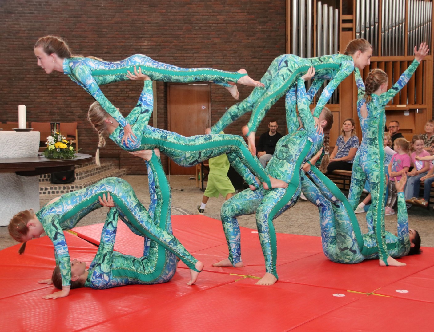 Zum 60. Geburtstag der Friedenskirche gab es am 6. Juli ein Gemeindefest. Es begann mit einem Gottesdienst für Große und Kleine, den Chor und KiTa-Kinder mitgestalteten. Kinder, die nach den Ferien zur Schule kommen, konnten sich segnen lassen. Im Anschluss war Gelegenheit für Begegnungen bei Kaffee und Kuchen sowie für Spiele und Aktionen, die von Mitarbeitenden der KiTa und des Jugendhauses vorbereitet worden waren. Im Gemeindezentrum waren kleine Schilder mit Zahlen angebracht. Sie gehörten zu einem Quiz: Es galt herauszufinden, wie viele 60-Schilder darunter waren. Drei Menschen lagen richtig und bekamen dafür einen Preis. Vorher war der Zirkus Butterfly des Konrad-Duden-Gymnasiums zu Gast. Das Programm begann im Foyer, dann wurde der Kirchraum zur Manege. Ein beeindrucker Abschluss der Geburtstagsfeier, die mit viel Applaus für die Artistinnnen und Artisten zu Ende ging. Hier weitere Eindrücke (Fotos: Wilfried Bühnen):