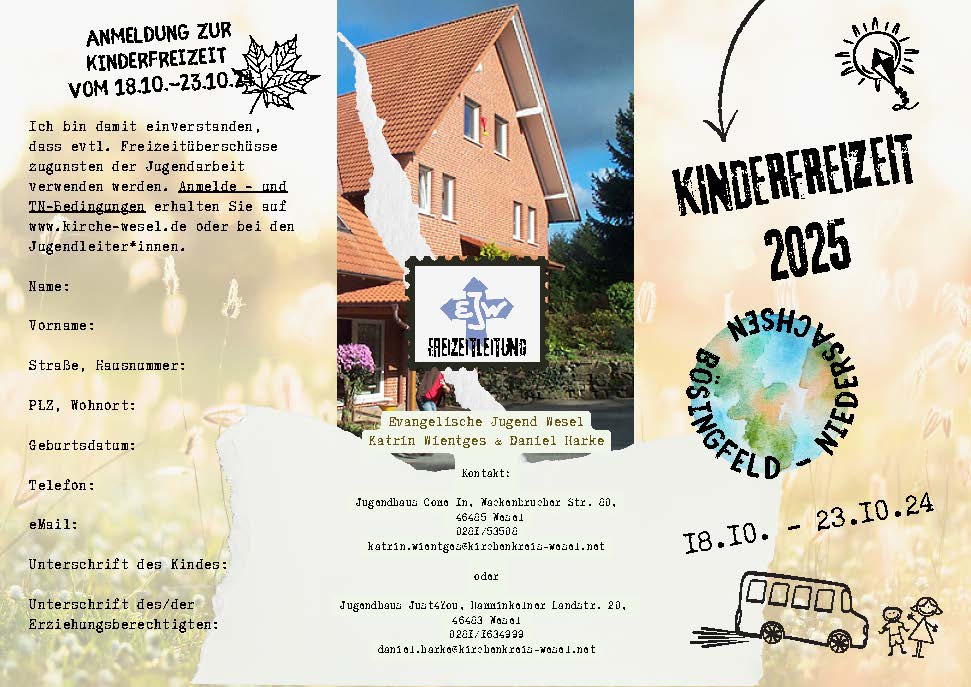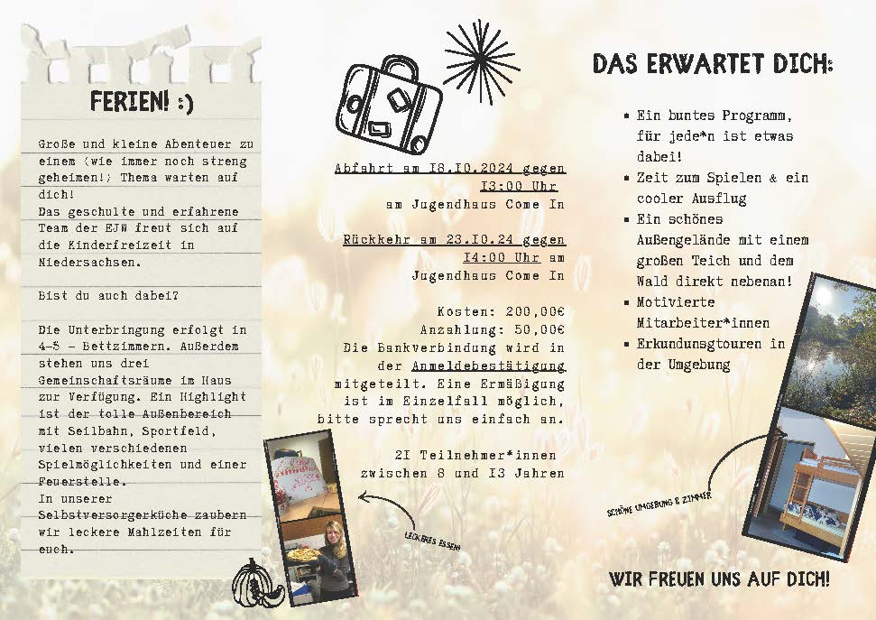 Auch in diesem Jahr geht es wieder auf Kinderfreizeit! Vom 18.10. - 23.10. geht es zusammen nach Niedersachsen, genauer gesagt nach Bösingfeld. Das Thema bleibt wie immer geheim. Wir können euch aber sagen, dass ein spannendes und vielseitiges Programm auf euch wartet. Meldet euch an, wir freuen uns auf euch!